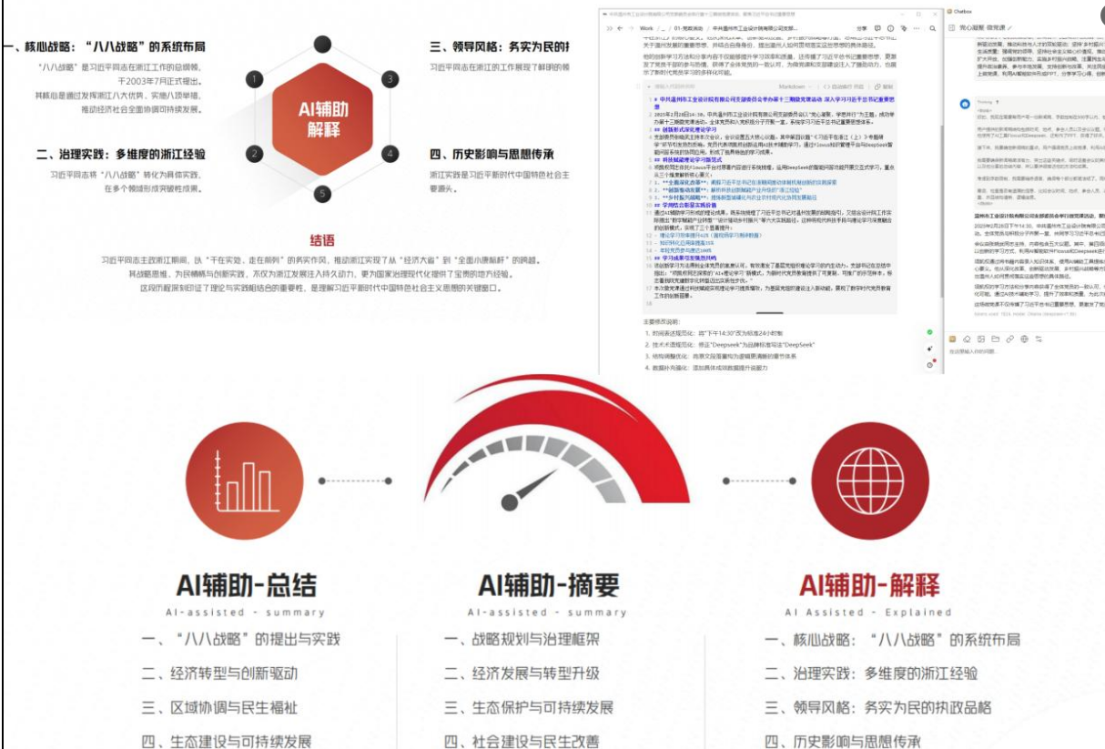 項(xiàng)凱權(quán)同志依托Flowus平臺(tái)對(duì)原著內(nèi)容進(jìn)行系統(tǒng)梳理了習(xí)近平總書記對(duì)浙江以及溫州發(fā)展的戰(zhàn)略指引,運(yùn)用DeepSeek的智能問答功能開展交互式學(xué)習(xí),重點(diǎn)從三個(gè)維度解析核心要義:一是全面深化改革,闡釋習(xí)近平總書記在浙江期間推動(dòng)體制機(jī)制創(chuàng)新的實(shí)踐探索;二是創(chuàng)新驅(qū)動(dòng)發(fā)展,解析科技創(chuàng)新賦能產(chǎn)業(yè)升級(jí)的"浙江經(jīng)驗(yàn)";三是鄉(xiāng)村振興戰(zhàn)略,提煉新型城鎮(zhèn)化與農(nóng)業(yè)農(nóng)村現(xiàn)代化協(xié)同發(fā)展路徑。
