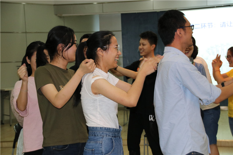 活動在勵志歌曲“追夢赤子心”的音樂聲中拉開序幕。大家在指導老師的引領下,分成二個小組共同進入“大風吹”“請讓我為你按摩一下下”“優(yōu)點轟炸”“銜紙杯傳水”